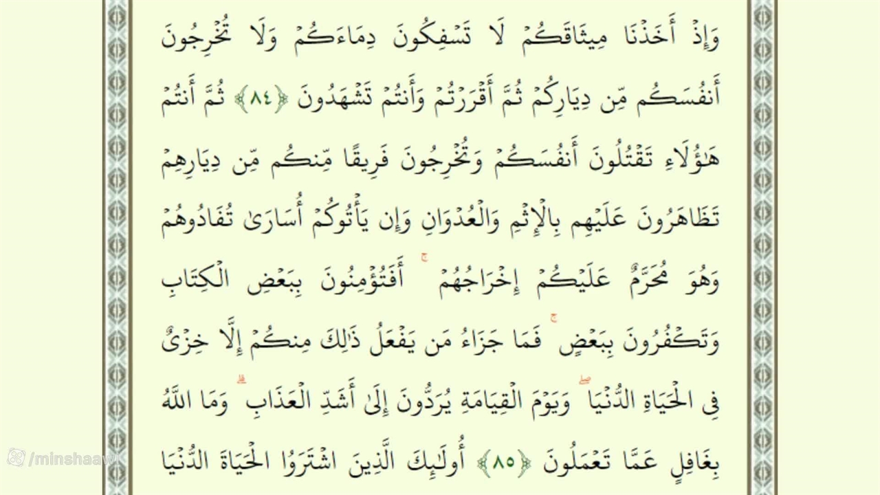 وَإِذْ أَخَذْنَا مِیثَاقَکُمْ لَا تَسْفِکُونَ دِمَاءَکُمْ وَلَا تُخْرِجُونَ أَنفُسَکُم مِّن دِیَارِکُمْ ثُمَّ أَقْرَرْتُمْ وَأَنتُمْ تَشْهَدُونَ ﴿٨٤﴾ ثُمَّ أَنتُمْ هَٰؤُلَاءِ تَقْتُلُونَ أَنفُسَکُمْ وَتُخْرِجُونَ فَرِیقًا مِّنکُم مِّن دِیَارِهِمْ تَظَاهَرُونَ عَلَیْهِم بِالْإِثْمِ وَالْعُدْوَانِ وَإِن یَأْتُوکُمْ أُسَارَىٰ تُفَادُوهُمْ وَهُوَ مُحَرَّمٌ عَلَیْکُمْ إِخْرَاجُهُمْ ۚ أَفَتُؤْمِنُونَ بِبَعْضِ الْکِتَابِ وَتَکْفُرُونَ بِبَعْضٍ ۚ فَمَا جَزَاءُ مَن یَفْعَلُ ذَٰلِکَ مِنکُمْ إِلَّا خِزْیٌ فِی الْحَیَاةِ الدُّنْیَا ۖ وَیَوْمَ الْقِیَامَةِ یُرَدُّونَ إِلَىٰ أَشَدِّ الْعَذَابِ ۗ وَمَا اللَّهُ بِغَافِلٍ عَمَّا تَعْمَلُونَ ﴿٨٥﴾ أُولَٰئِکَ الَّذِینَ اشْتَرَوُا الْحَیَاةَ الدُّنْیَا بِالْآخِرَةِ ۖ فَلَا یُخَفَّفُ عَنْهُمُ الْعَذَابُ وَلَا هُمْ یُنصَرُونَ ﴿٨٦﴾ وَلَقَدْ آتَیْنَا مُوسَى الْکِتَابَ وَقَفَّیْنَا مِن بَعْدِهِ بِالرُّسُلِ ۖ وَآتَیْنَا عِیسَى ابْنَ مَرْیَمَ الْبَیِّنَاتِ وَأَیَّدْنَاهُ بِرُوحِ الْقُدُسِ ۗ أَفَکُلَّمَا جَاءَکُمْ رَسُولٌ بِمَا لَا تَهْوَىٰ أَنفُسُکُمُ اسْتَکْبَرْتُمْ فَفَرِیقًا کَذَّبْتُمْ وَفَرِیقًا تَقْتُلُونَ ﴿٨٧﴾ وَقَالُوا قُلُوبُنَا غُلْفٌ ۚ بَل لَّعَنَهُمُ اللَّهُ بِکُفْرِهِمْ فَقَلِیلًا مَّا یُؤْمِنُونَ ﴿٨٨﴾