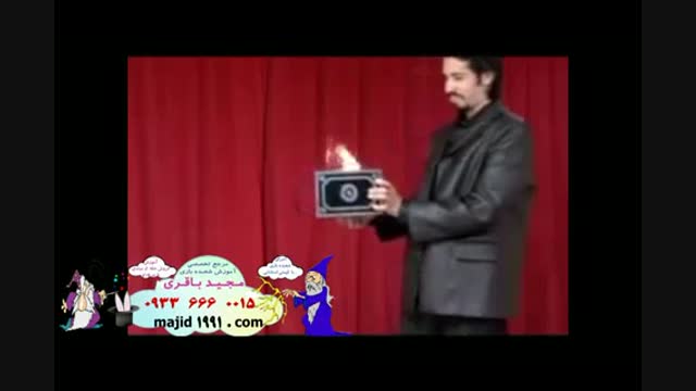 با اشاره شعبده باز ، درون جعبه آتش میگیرد و شعله ور میشود