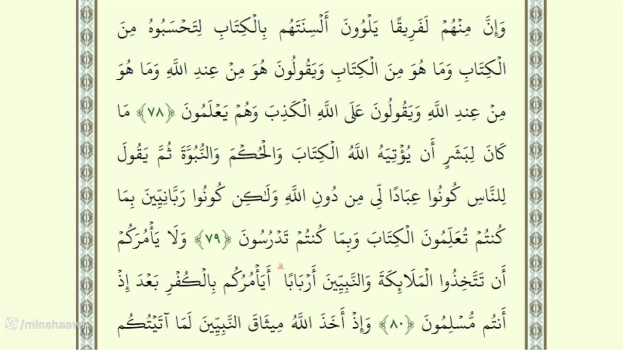 وَإِنَّ مِنْهُمْ لَفَرِیقًا یَلْوُونَ أَلْسِنَتَهُم بِالْکِتَابِ لِتَحْسَبُوهُ مِنَ الْکِتَابِ وَمَا هُوَ مِنَ الْکِتَابِ وَیَقُولُونَ هُوَ مِنْ عِندِ اللَّهِ وَمَا هُوَ مِنْ عِندِ اللَّهِ وَیَقُولُونَ عَلَى اللَّهِ الْکَذِبَ وَهُمْ یَعْلَمُونَ ﴿٧٨﴾ مَا کَانَ لِبَشَرٍ أَن یُؤْتِیَهُ اللَّهُ الْکِتَابَ وَالْحُکْمَ وَالنُّبُوَّةَ ثُمَّ یَقُولَ لِلنَّاسِ کُونُوا عِبَادًا لِّی مِن دُونِ اللَّهِ وَلَٰکِن کُونُوا رَبَّانِیِّینَ بِمَا کُنتُمْ تُعَلِّمُونَ الْکِتَابَ وَبِمَا کُنتُمْ تَدْرُسُونَ ﴿٧٩﴾ وَلَا یَأْمُرَکُمْ أَن تَتَّخِذُوا الْمَلَائِکَةَ وَالنَّبِیِّینَ أَرْبَابًا ۗ أَیَأْمُرُکُم بِالْکُفْرِ بَعْدَ إِذْ أَنتُم مُّسْلِمُونَ ﴿٨٠﴾ وَإِذْ أَخَذَ اللَّهُ مِیثَاقَ النَّبِیِّینَ لَمَا آتَیْتُکُم مِّن کِتَابٍ وَحِکْمَةٍ ثُمَّ جَاءَکُمْ رَسُولٌ مُّصَدِّقٌ لِّمَا مَعَکُمْ لَتُؤْمِنُنَّ بِهِ وَلَتَنصُرُنَّهُ ۚ قَالَ أَأَقْرَرْتُمْ وَأَخَذْتُمْ عَلَىٰ ذَٰلِکُمْ إِصْرِی ۖ قَالُوا أَقْرَرْنَا ۚ قَالَ فَاشْهَدُوا وَأَنَا مَعَکُم مِّنَ الشَّاهِدِینَ ﴿٨١﴾ فَمَن تَوَلَّىٰ بَعْدَ ذَٰلِکَ فَأُولَٰئِکَ هُمُ الْفَاسِقُونَ ﴿٨٢﴾ أَفَغَیْرَ دِینِ اللَّهِ یَبْغُونَ وَلَهُ أَسْلَمَ مَن فِی السَّمَاوَاتِ وَالْأَرْضِ طَوْعًا وَکَرْهًا وَإِلَیْهِ یُرْجَعُونَ ﴿٨٣﴾
