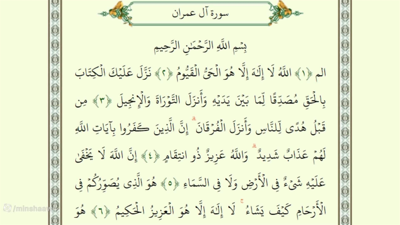 الم ﴿١﴾ اللَّهُ لَا إِلَٰهَ إِلَّا هُوَ الْحَیُّ الْقَیُّومُ ﴿٢﴾ نَزَّلَ عَلَیْکَ الْکِتَابَ بِالْحَقِّ مُصَدِّقًا لِّمَا بَیْنَ یَدَیْهِ وَأَنزَلَ التَّوْرَاةَ وَالْإِنجِیلَ ﴿٣﴾ مِن قَبْلُ هُدًى لِّلنَّاسِ وَأَنزَلَ الْفُرْقَانَ ۗ إِنَّ الَّذِینَ کَفَرُوا بِآیَاتِ اللَّهِ لَهُمْ عَذَابٌ شَدِیدٌ ۗ وَاللَّهُ عَزِیزٌ ذُو انتِقَامٍ ﴿٤﴾ إِنَّ اللَّهَ لَا یَخْفَىٰ عَلَیْهِ شَیْءٌ فِی الْأَرْضِ وَلَا فِی السَّمَاءِ ﴿٥﴾ هُوَ الَّذِی یُصَوِّرُکُمْ فِی الْأَرْحَامِ کَیْفَ یَشَاءُ ۚ لَا إِلَٰهَ إِلَّا هُوَ الْعَزِیزُ الْحَکِیمُ ﴿٦﴾ هُوَ الَّذِی أَنزَلَ عَلَیْکَ الْکِتَابَ مِنْهُ آیَاتٌ مُّحْکَمَاتٌ هُنَّ أُمُّ الْکِتَابِ وَأُخَرُ مُتَشَابِهَاتٌ ۖ فَأَمَّا الَّذِینَ فِی قُلُوبِهِمْ زَیْغٌ فَیَتَّبِعُونَ مَا تَشَابَهَ مِنْهُ ابْتِغَاءَ الْفِتْنَةِ وَابْتِغَاءَ تَأْوِیلِهِ ۗ وَمَا یَعْلَمُ تَأْوِیلَهُ إِلَّا اللَّهُ ۗ وَالرَّاسِخُونَ فِی الْعِلْمِ یَقُولُونَ آمَنَّا بِهِ کُلٌّ مِّنْ عِندِ رَبِّنَا ۗ وَمَا یَذَّکَّرُ إِلَّا أُولُو الْأَلْبَابِ ﴿٧﴾ رَبَّنَا لَا تُزِغْ قُلُوبَنَا بَعْدَ إِذْ هَدَیْتَنَا وَهَبْ لَنَا مِن لَّدُنکَ رَحْمَةً ۚ إِنَّکَ أَنتَ الْوَهَّابُ ﴿٨﴾ رَبَّنَا إِنَّکَ جَامِعُ النَّاسِ لِیَوْمٍ لَّا رَیْبَ فِیهِ ۚ إِنَّ اللَّهَ لَا یُخْلِفُ الْمِیعَادَ ﴿٩﴾