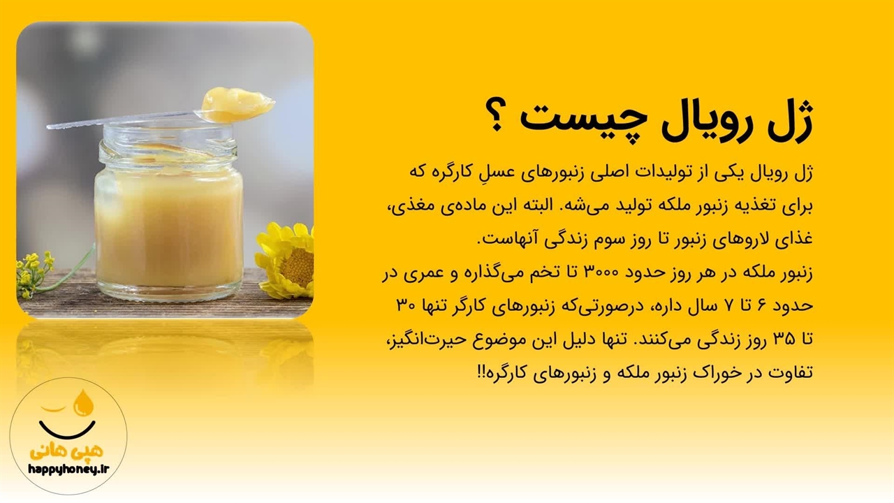ژل رویال یکی از تولیدات اصلی زنبورهای عسلِ کارگر است که آنرا برای تغذیه زنبور ملکه تولید میکنند. البته این مادهی مغذی، غذای لاروهای زنبور تا روز سوم زندگی نیز آنهاست. https://happyhoney.ir/royal-jelly/